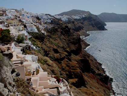 Bright and early in the morning, we took a rocky boat ride from Sea Cloud, past the youngest island of Nea Kameni (“New burned island”) to the port of Athenios, and drove through several villages overlooking the rim of the caldera, on our way to the town of Oia. Oia is a stunning village on the north rim of the caldera, known for its beautiful sunsets and picturesque white and blue houses. We spent the morning wandering the MC Escher-like footpaths and stairways, practicing our photographic skills and taking advantage of the Greek specialties offered by the many shops that crowd the narrow paths.