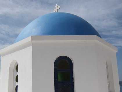 After a lunch of mezedes and local wine in the village of Pyrgos, we departed for the archaeological site of Akrotiri. Although only a small fraction of the original settlement has been excavated, finds at this site have revealed an initial settlement dating to the Neolithic period and, later, in the Middle Cycladic period, a thriving Minoan trading colony. Wealthy merchants in this 17th century B.C. city occupied two and three-story houses with interior plumbing and large windows. The interior walls were originally decorated with lively, colorful frescoes: women gathering saffron, playful monkeys, and a ceremonial procession of ships. The delicate frescoes have been removed from the site in order to preserve them, and some of these exquisite works may be viewed at the Archaeological Museum in Athens.