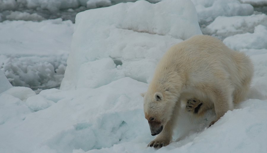 After dinner we continued north in Hinlopen, the body of water that separates the main island Spitsbergen and Nordaustlandet with its major icecap. We finally found some nice fast ice or sea ice, which is attached to land in a sheltered fjord or bay. Here we were able to spot more bears, including a distant female with a cub. The final count on bears today ended with 18, including several quality bears.