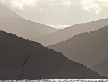 The morning began with a spectacular sunrise over Karukinka. Any one awake early in the morning got first looks at the rugged skyline behind Jackson Bay and some of the wildlife including black-browed albatross that nest on one of the nearby small islands. Soon after breakfast we were given the plan for the morning by the expedition leader, Lucho. Landing at Jackson Bay we found a trail to a lovely waterfall. Also we discovered huge marine mammals, Southern Elephant Seals, resting on not only the beach but even high in the grass meadow and even in the small river draining the valley inland. Many, many photographic images were captured of this lovely spot.