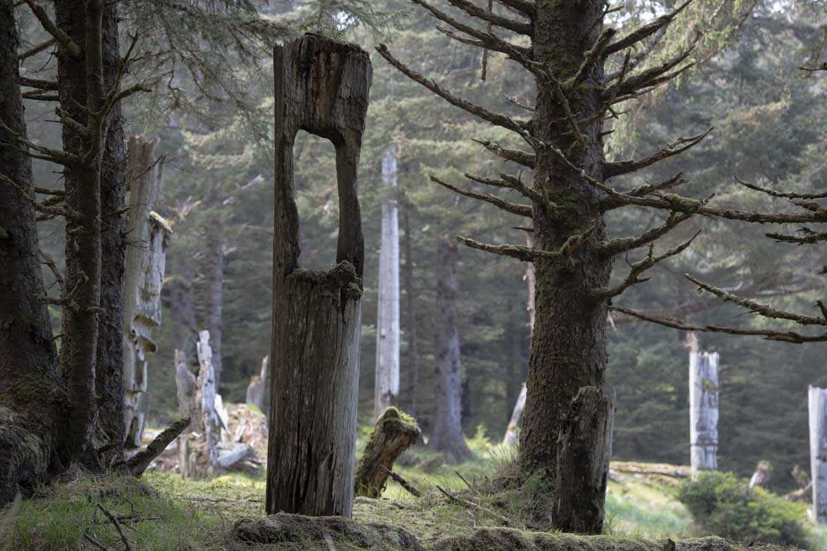 Fog blankets the forest as we walk silently through the cathedral of old growth. We are in a scared place, a place where the trees tell the story of the people who once lived and thrived here. Today, we recognize the significance of the culture of the people who would walk these trails, fish these waters, and sit around warming fires passing down the stories of the ones that went before. In times past, during the first contact with Europeans, small pox, nearly wiped out not just the people here, but native people up and down the cost of British Columbia. We are at Sgang Gwaay, a world heritage site, located on Ninstints Island, in Gwaii Haanas National Park, on one of the more than 400 islands known as Haida Gwaii. This is an especially important place, Sgang Gwaay is the one of the best examples of life as the Haida knew it before contact. The middens, house pits, and the many poles both fallen and upright tell the story of the people who lived here on the rich bounty that surrounding sea provided them.