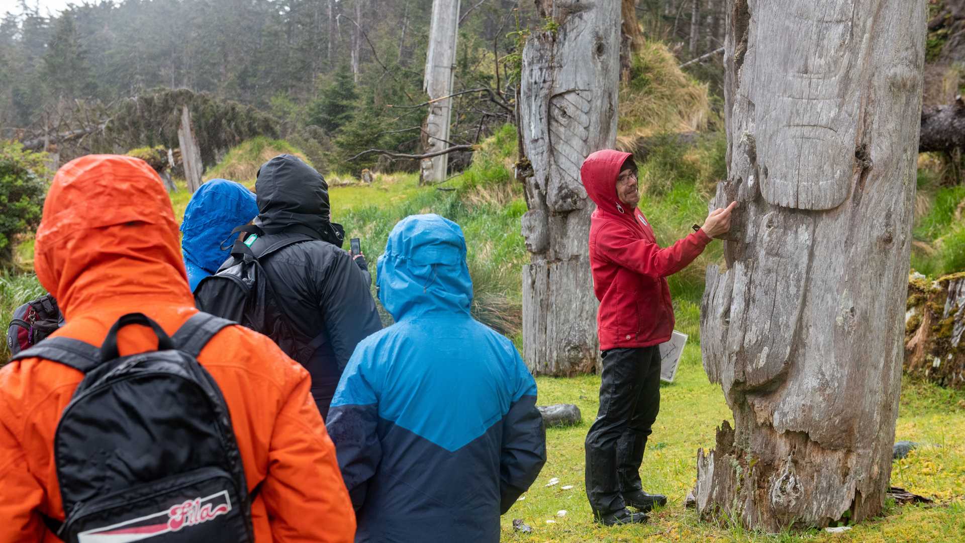 Today, we explored the island of Sgang Gwaay in Gwaii Haanas National Park Reserve, National Marine Conservation Area Reserve, and Haida Heritage Site. We took a Zodiac ride to the northern part of the island. We walked down a boardwalk path to the site of Sgang Gwaay Llnagaay, an ancient village and sheltered bay. The area became a UNESCO National Heritage Site in 1981. It is one of the best examples of a traditional Northwest Coast First Nations village. Despite the rainy weather, we had an excellent time exploring the site with our local Watchman guide, Paul.