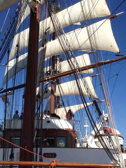 After a peaceful night upon the calm sea, we awoke to a beautiful sunny day. After breakfast we eagerly awaited the setting of the sails on the lido deck while we attempted to memorize the names of each of the four masts, 29 sails, and their functions. As Tom announced that the captain had cleared the 18 sailors to prep the sails, a silence fell over the crowd as we watched in anticipation. Suddenly, like a scene out of movie, the sailors began to climb the masts up to 140 feet high. We listened in awe while Tom narrated what each crewmember was doing as the impressive square sails were rigged high above us. We were lucky enough to climb up to the foc’scle at the bow if the ship to finish the lesson and watch the sailors set the last sail.