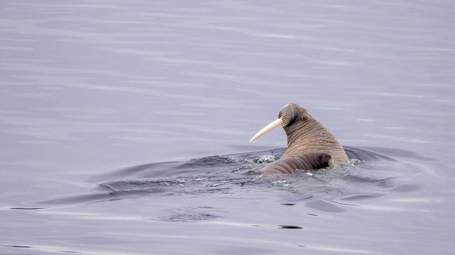 We were awakened this morning by the sound of National Geographic Endurance crushing through fast ice. The excitement was high as our plan was to visit a small group of islands known as the Sjuøyene (the seven islands) on the northeast side of Nordauslandet. Approaching Phippsøya, the largest island of the group, we encountered a female walrus swimming with her calf. Scout boats were sent out and it was determined that a landing was not possible, so we continued searching for wildlife. Our efforts were rewarded as we found a single polar bear sleeping on an ice floe. The bear was quite content to sleep away the morning, even as we watched and took photographs.