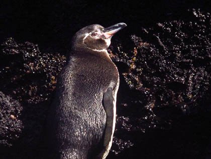 Wow! There is no other way to describe the fantastic day we had. Today we reached the central area of the Galápagos, and our first island was Sombrero Chino, a small spatter cone off the coast of Santiago Island. Dividing both islands is a channel with crystal-clear turquoise waters. Just after breakfast, we left the National Geographic Islander to explore the coastline from our Zodiacs. Our goal: to find the elegant Galápagos penguins. A small colony inhabits this area, and since the weather conditions were clear and sunny, many were already in the water chasing the little fish. One penguin seemed to have had enough and gave us the wonderful opportunity of photographing it standing on some rocks. What a treat!