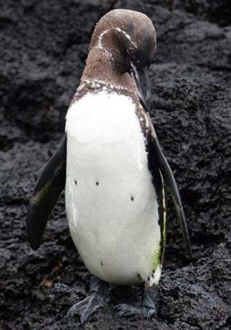 The morning proved to be overcast, even slightly misty, but with very comfortable temperatures. We departed by Zodiac right after breakfast in search of the Galapagos penguins. These sea birds are not numerous, and their population status is quite delicate. Variable climatic conditions can cause them to have either good, or bad, reproductive success. We were lucky to have one little individual leave the water just as we drove by. She/he stood upright, as penguins do, and groomed itself thoroughly before once more popping back into the ocean. Nearby were two blue-footed boobies and a brown pelican. It seemed we had it all for a few moments.