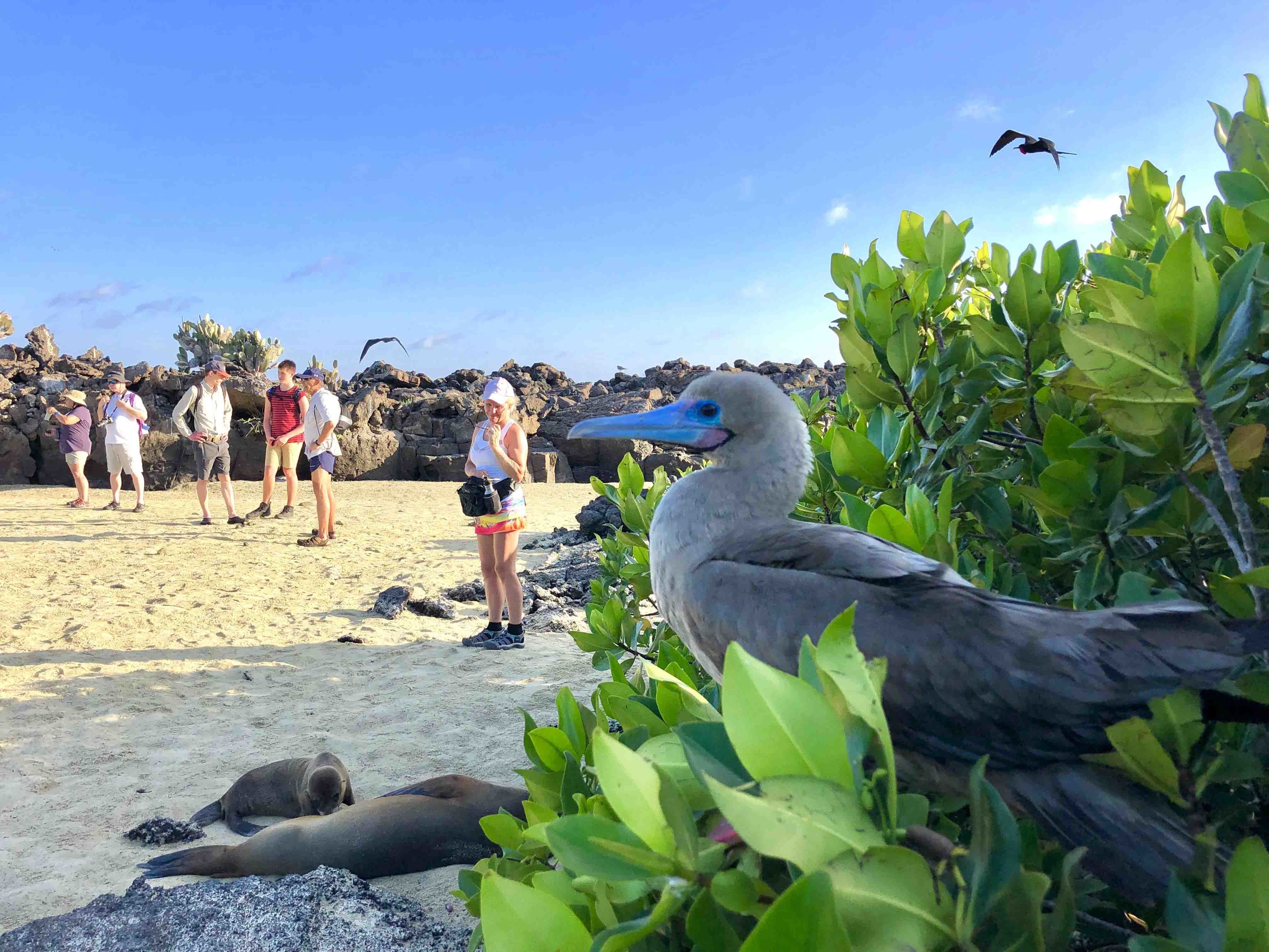 It’s our first full day of expedition on National Geographic Islander . We started our day with a morning hike on North Seymour, which is one of the best islands to observe nesting colonies of frigatebirds, blue-footed boobies, swallow-tailed gulls, and many more species of marine birds. Later in the morning, National Geographic Islander navigated to the beautiful Rabida Island, where we enjoyed an amazing afternoon. Guests swam and snorkeled with sea lions and many different species of reef fish off the red sand beach. We walked to a pond located behind the beach and observed flamingos nesting after more than 20 years on this island.