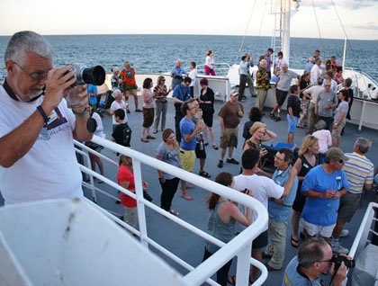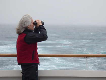 The day crept in slowly from dark to first light. A grey mist obscured the horizon and birds appeared and disappeared back into the fog. Many of us slept in this morning. Our rooms were dark even after dawn. Last night we were careful to close the blinds and porthole covers in an effort to keep the lights of our ship from leaking outside. Small seabirds with webbed feet designed for taking off from the surface of the sea, are attracted to the ship’s lights. Once they land aboard, they cannot take off from the hard surfaces of our decks. We were successful last night as no birds were found on our ship this morning.