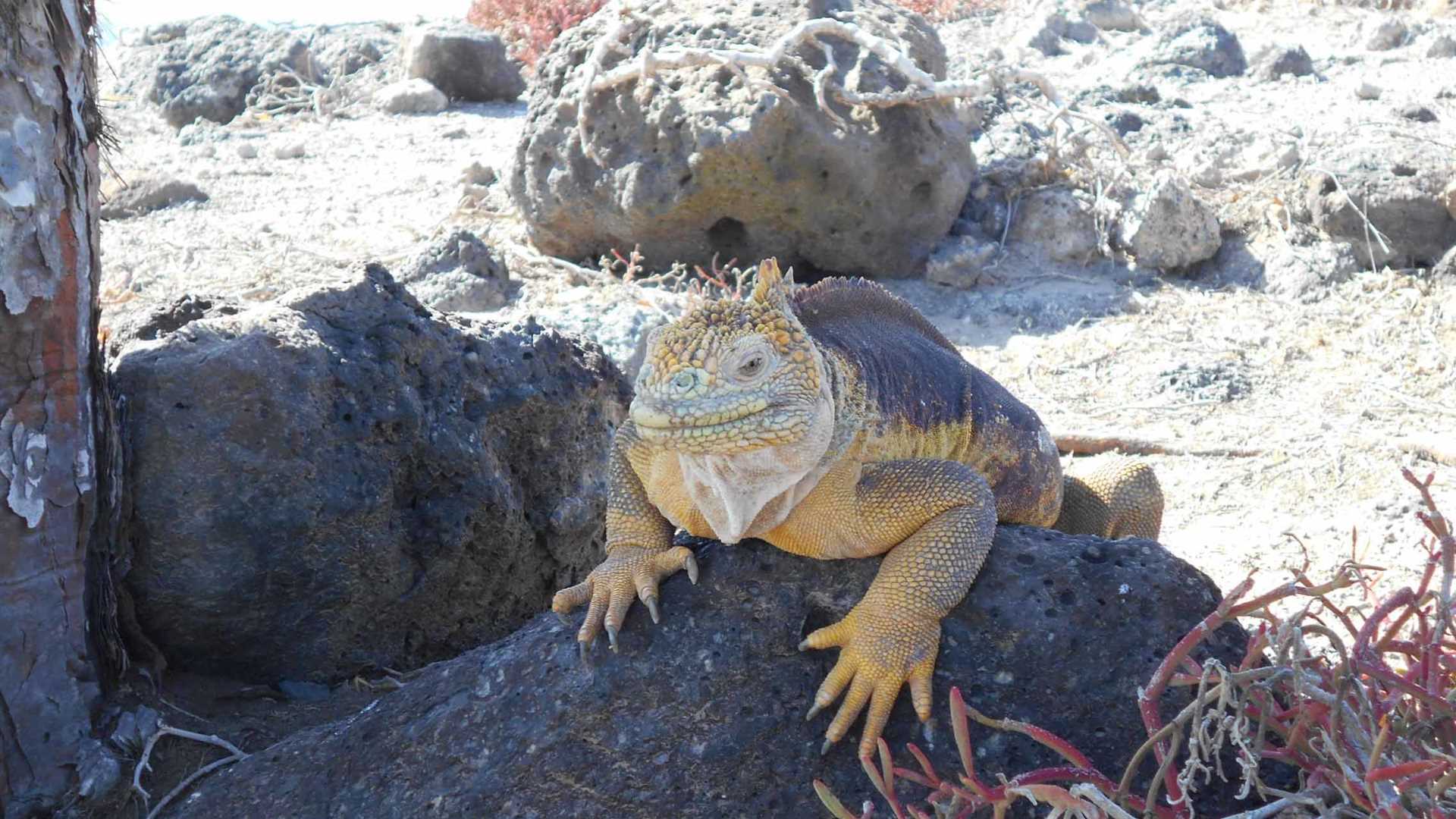 Today we had a sunny morning with a nice breeze, excellent for our two-hour hike on South Plaza, which is a tiny island of the Galapagos Archipelago, less than one square mile, but with lots of wildlife and an impressive landscape. At the landing spot there is a colony of sea lions, and the pups were playfully waiting for us. Right next to the landing platform we were able to see a group of land iguanas resting under giant cactus trees. Just a little bit further we saw another of the unique species of the islands, the wonderful swallow tailed gulls, nesting on the ground right next to the trail. The island is very interesting geologically speaking, it has the shape of a ramp and is one of the few that resulted from the uplifts of colliding mini plates, so one side is a high cliff about 50 feet, while the other is only few inches above the water. Since the island is so little, it is possible to see the ocean water from every single point of the trail. The combination of colors such as the blue turquoise surrounding the place, and the red and green of the vegetation is simply marvelous. After this experience, we went back to our vessel and we had the chance to swim and refresh ourselves.