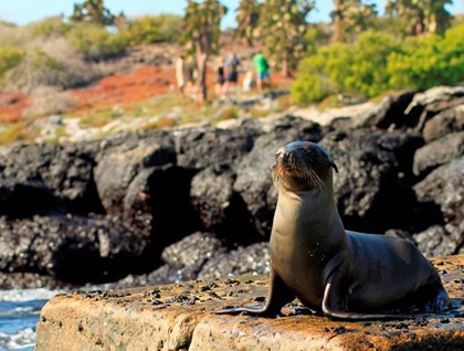 After lunch we went kayaking and snorkeling along Santa Fe Island. In this location there is remarkable volcanic scenery where cliffs are filled with giant prickly pear cacti. Both kayakers and snorkelers had a blast. Kayakers had the company of many sea lions and snorkelers shared some time with a couple of spotted eagle rays that were seen mating underwater.