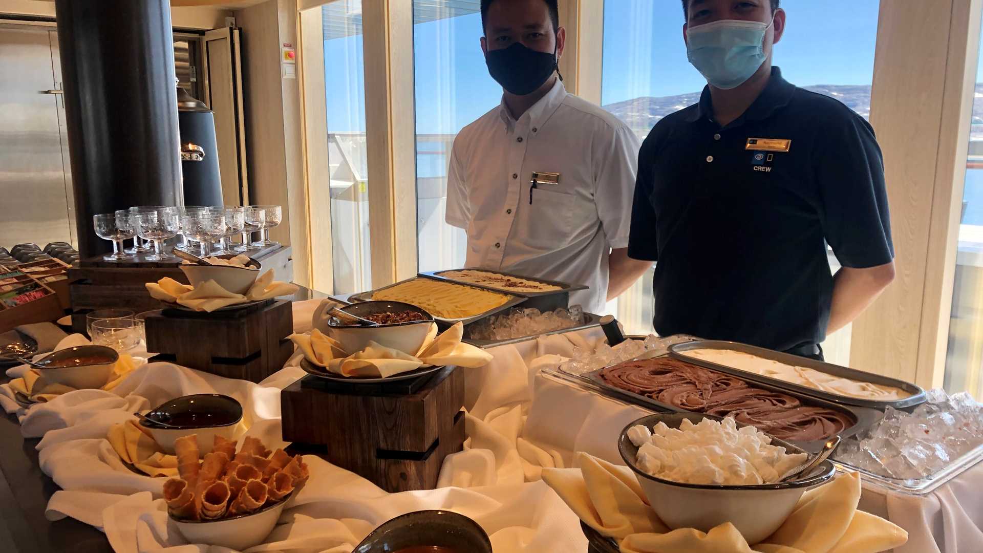A leisurely afternoon followed as the ship sailed back towards the entrance of Napassorssuag Fjord. The infallible hotel department hosted an ice cream party on Deck 8, and it provided a memorable means by which to take in the view as we sailed toward our next destination, a location spotted by expedition leader Russ as we passed by in the early morning. With the weather remaining firmly on our side, the blue skies and sunshine illuminated another dramatic pocket of Napassorssuag Fjord – a bay and channel area wherein an array of dramatic icebergs awaited us. What better way to experience this area than by Zodiac? As we hopped aboard, few of us could imagine the exceptional ice sculptures that awaited us as we cruised through what was akin to a harbor filled with icebergs rather than boats. For two hours, the hues, shapes, sizes, and even sounds of the icebergs continued to enthrall us, before we had to return to the ship where we continued our expedition along the southeast coast of Greenland.