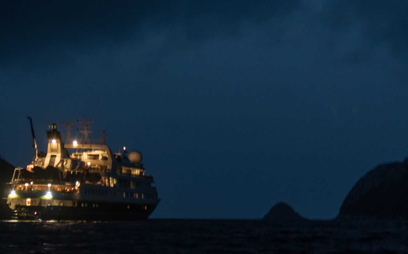 It dawned upon the naturalist staff that we had beaten the sun to rise as we arrived at the silhouette of Puerto Cook’s peaks. Equipped with fresh coffee and our Zodiacs mounted with lights, we braved the wind and rain to reach the looming remains of Staten Island’s prison and cemetery left from the early twentieth century. A blue light washed over the early hikers’ path, traversing across Staten Island – a whopping half mile, each way. After drying off and a quick repositioning, we reached our next outing at the recreation of author Jules Verne’s iconic Lighthouse at the End of the World. Once the hikers had set out from the landing towards the lighthouse, the undersea team went for a dive in the thriving kelp forest nearby.