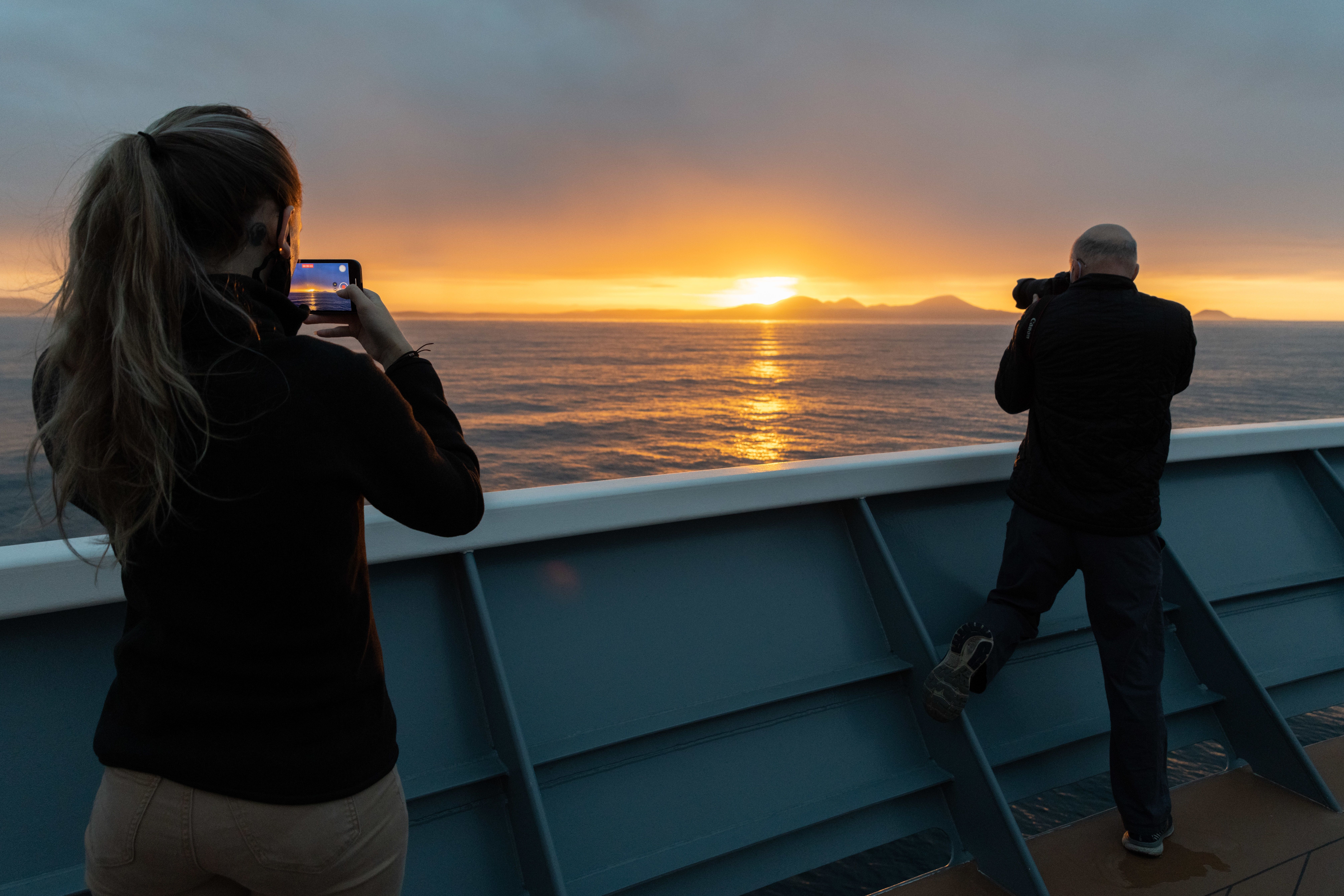 Guests were happy to stretch their legs on a casual hike over the island terrain, walking through tussock areas and passing by the black-browed Albatross colony and the playful Gentoo penguins in their colony. Members of the ship’s crew, including Captain Yuri and Hotel Manager Anders, also came ashore to take some time from their normal busy routine.