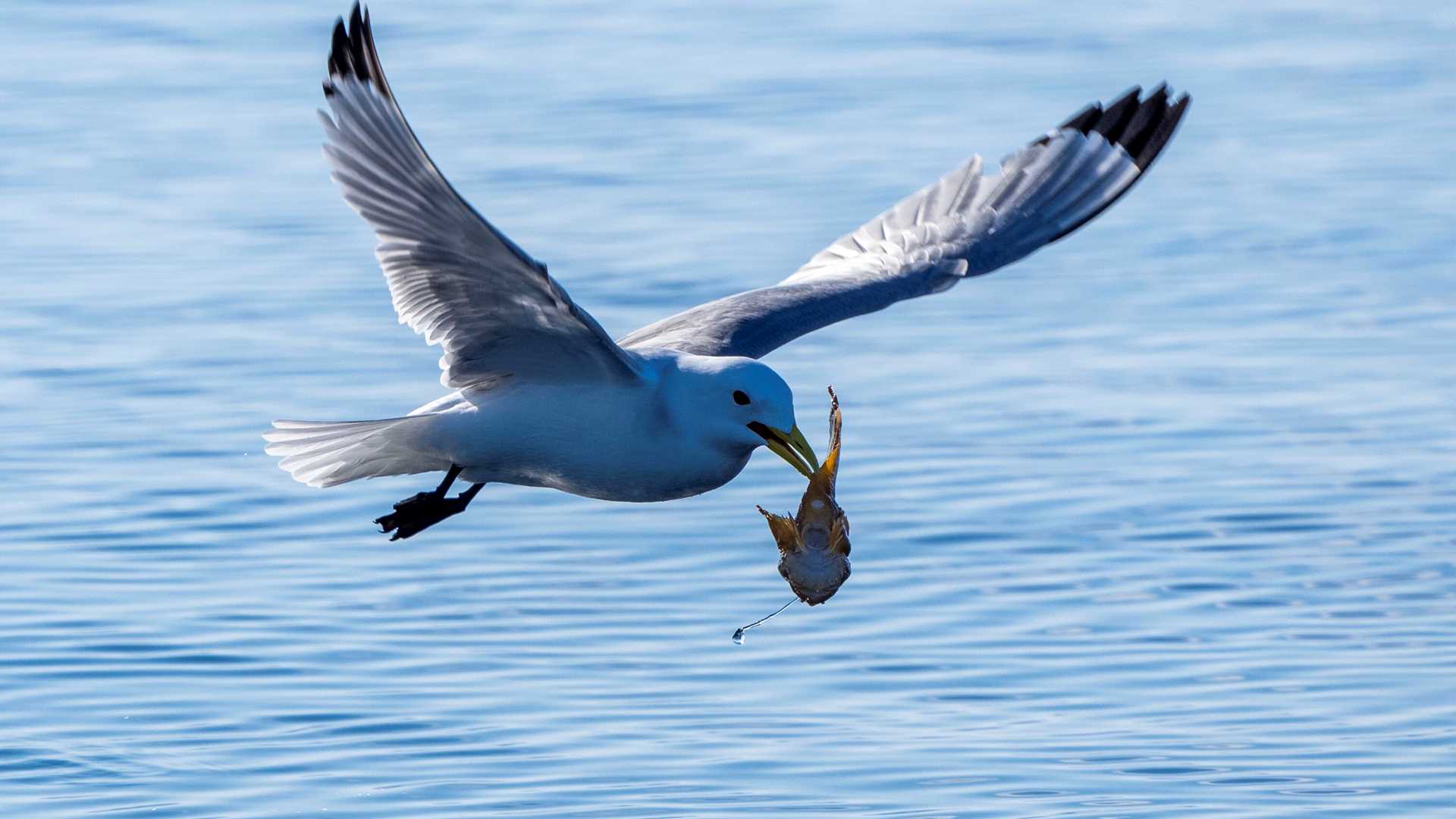 In the early morning, we woke up to the wonderful news of a polar bear sighting. We spent over an hour looking on as this iconic animal moved along the waterline on the ice edge, entered the water, fed on kelp, and displayed curiosity in its surroundings. The calm sea and blue sky on the eastern side of Svalbard allowed us to get the Zodiacs out on the water to explore in better detail. There was an interesting combination of glacial ice, sea ice at different stages of formation, with a spectacular backdrop of perfectly white snowy mountains. While cruising the fjord, we had close views of black guillemots, kittiwakes, and northern fulmars, and some of us spotted Arctic fox tracks on the snowy fast ice.