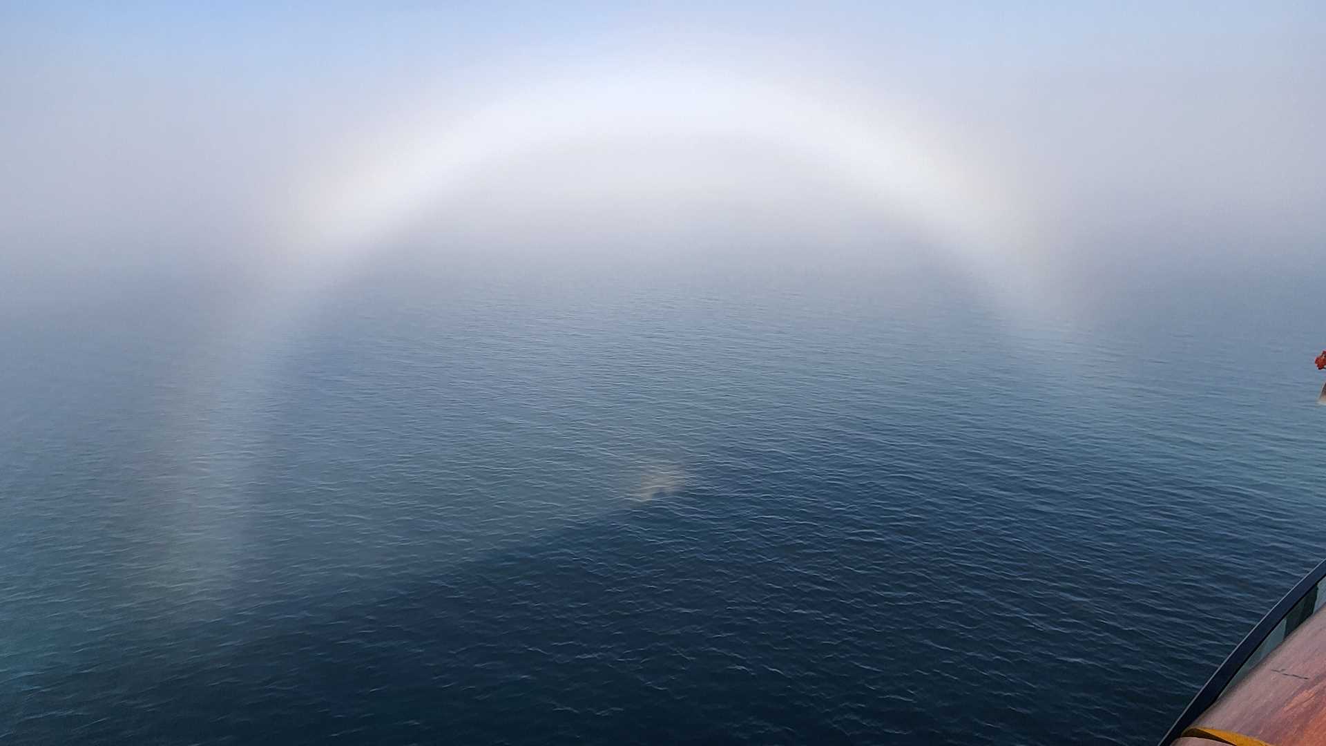 The fog did lift briefly as we approached some drift ice, and we were treated to some views of bearded seals. At another point in the day, the fog cleared just enough to give us a view of a beautiful fogbow, as well as a Brocken spectre and glory.