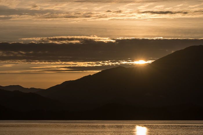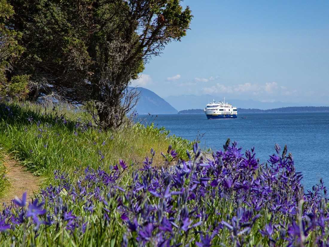 We spent our final day in the San Juan Islands, a beautiful archipelago wedged between Washington State and the south end of Vancouver Island. We began the day by docking in Friday Harbor to clear U.S. Customs before exploring the small town that has become famous across the world for its iconic whale watching. Over the last couple of decades, the resident southern orca whales that have come to define this place have shrunk in numbers due to a variety of factors, including overfishing, climate change, and depleted salmon habitats. Hard-working people at the Whale Research Center and the nearby whale museum are working hard to educate the public and enact laws to protect salmon habitats and provide more space for the orcas among the boat traffic and people that love them so much. Many of us took the opportunity to visit the whale museum near the dock, where the life histories and family trees of these amazing animals have been meticulously documented for decades. In the afternoon, we cruised a short distance north to Jones Island, a marine state park with a maze of trails and campsites framed by a gorgeous forest of cedar, fir, and madrone trees. To cap off our two-week excursion through the Inside Passage, we sailed through the last of the San Juan Islands while an epic sunset bid us farewell.