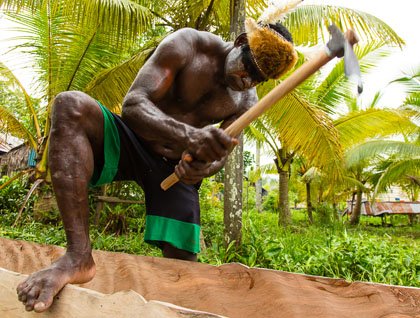 The ceremony is the real deal. The war canoes gather at the river mouth, where the warriors work themselves into a frenzy before storming ashore. The warriors carry a fresh cut tree from the forest, which will be carved into a Bisj Pole, which honors the dead. Traditionally, a cycle of revenge ensues ending in the ceremonial killing (and eating) of an enemy. This is where Michael C. Rockefeller disappeared in 1961, a victim of cannibalism, being in the wrong place at the wrong time.