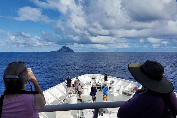 We had spent the night anchored in front of Taha’a, which is a neighboring island of Ra’iatea. As the sun began to rise, a lovely set of mountains, covered with clouds, could easily be seen from National Geographic Orion.
