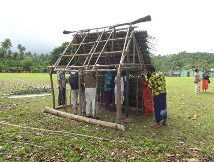 During lunch, we entered the much calmer waters in the lee of Taveuni Island and found a good anchorage. We soon located a tiny harbor on northwest side that is protected by jetties built out of stacked rocks that didn’t look like they could survive any sort of major storm, but that didn’t worry us today. It gave us a perfect quiet landing site from which to start our shoreside visit in the early afternoon. We were met by three “open air” buses and taken on a 1.5 hours-long drive around the island (part ways on a tarred road and part ways on a dirt road) to the northeast side to the quaint village of Waitabu, located right on the coast. We were welcomed by the village people with a traditional Kava ceremony. Afterward, some of us went with local boats to another beach site for some snorkeling on the reef edge, while most of us remained in the village and enjoyed watching some interesting demonstrations put on by the locals showing us some of their traditional activities. We were fascinated by the woman who made tapa cloth from the inner bark of the Pacific mulberry tree. It is a labor-intensive procedure that must take a long time to make finished pieces like the ones on display. The men invited us to take part in the construction of a small structure made of wooden poles and coconut palm thatch. It was a lot simpler than it looked. Some of us went on guided tours of the village, while others mellowed out by drinking kava, singing, and dancing with the villagers.