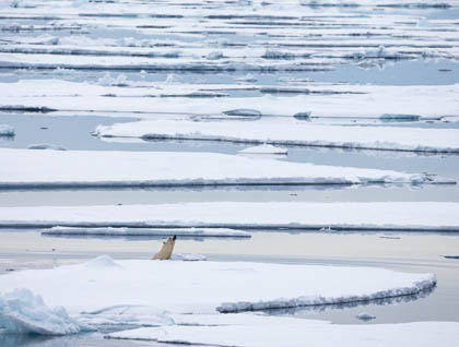 It was decision time…back to bed, or stay up? Many decided to stay up, and this was the right decision, with another bear being sighted briefly swimming near to the ship, and then a third bear just around 0630. This bear was walking through slightly denser pack ice, then dropping out of sight for periods of time as it swam and hunted for seals. We had quite good views of it dropping into the water, swimming, and peering up onto the ice, sometimes hauling out and walking for short distances over the ice. But these bears were all clearly on a mission with one thing in mind—food! And unfortunately there was not a lot of it around with only a couple of ringed seals being seen all day. We got closer to this third bear, but with it taking to the water and swimming and hunting, the captain gave it plenty of room, and after some time watching it, we again edged away to leave it to its hunt for prey.