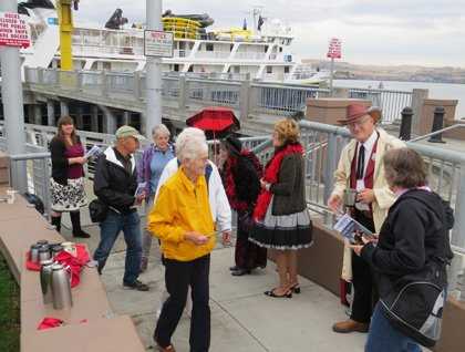 Today was another full and exciting day of exploration. We disembarked at the city of The Dalles where we were given a warm and boisterous welcome by local volunteers in period costume. We made a brief stop at Lewis and Clark’s Fort Rock campsite where they stayed while going downriver in 1805 and upriver in 1806. We then travelled on a portion of the old Historic Columbia River Highway to Rowena Crest Viewpoint where we had dramatic views up and down the Columbia. We have been surrounded by basalt and long stretches of history, both geologic and human!