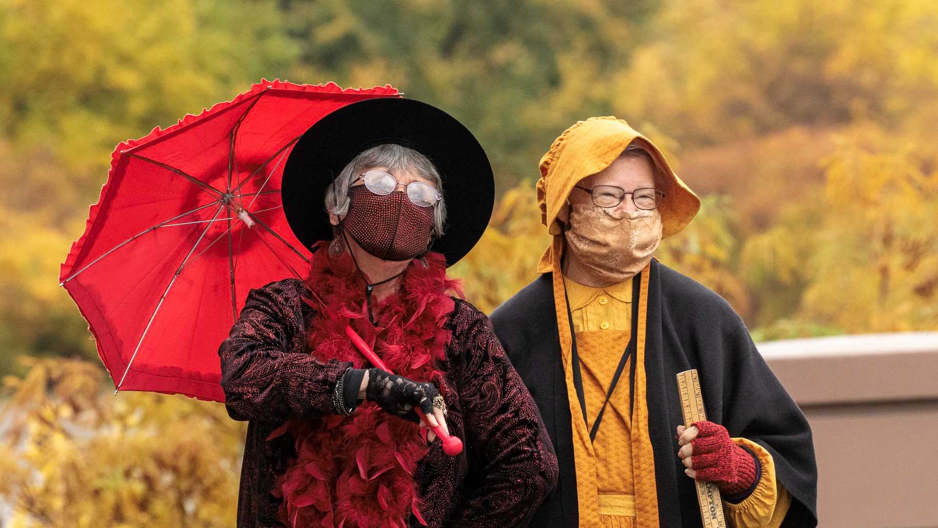 Our second day in the beautiful autumnal forests of the Columbia River Gorge began in the small city of The Dalles, where we boarded our coaches for a morning’s scenic drive on the old two-lane highway that winds along the cliffs on Oregon’s side of the river. We stopped for a delightful hike through the colorful oaks and maples along the old route of the highway (now closed to motorized traffic) and then drove to the Rowena Crest overlook for a fantastic view of the eastern end of the gorge. Our afternoon was spent cruising through the gorge, admiring the scenery from every new angle and enjoying our final lock passage through the Bonneville Dam. Then the pirates appeared!