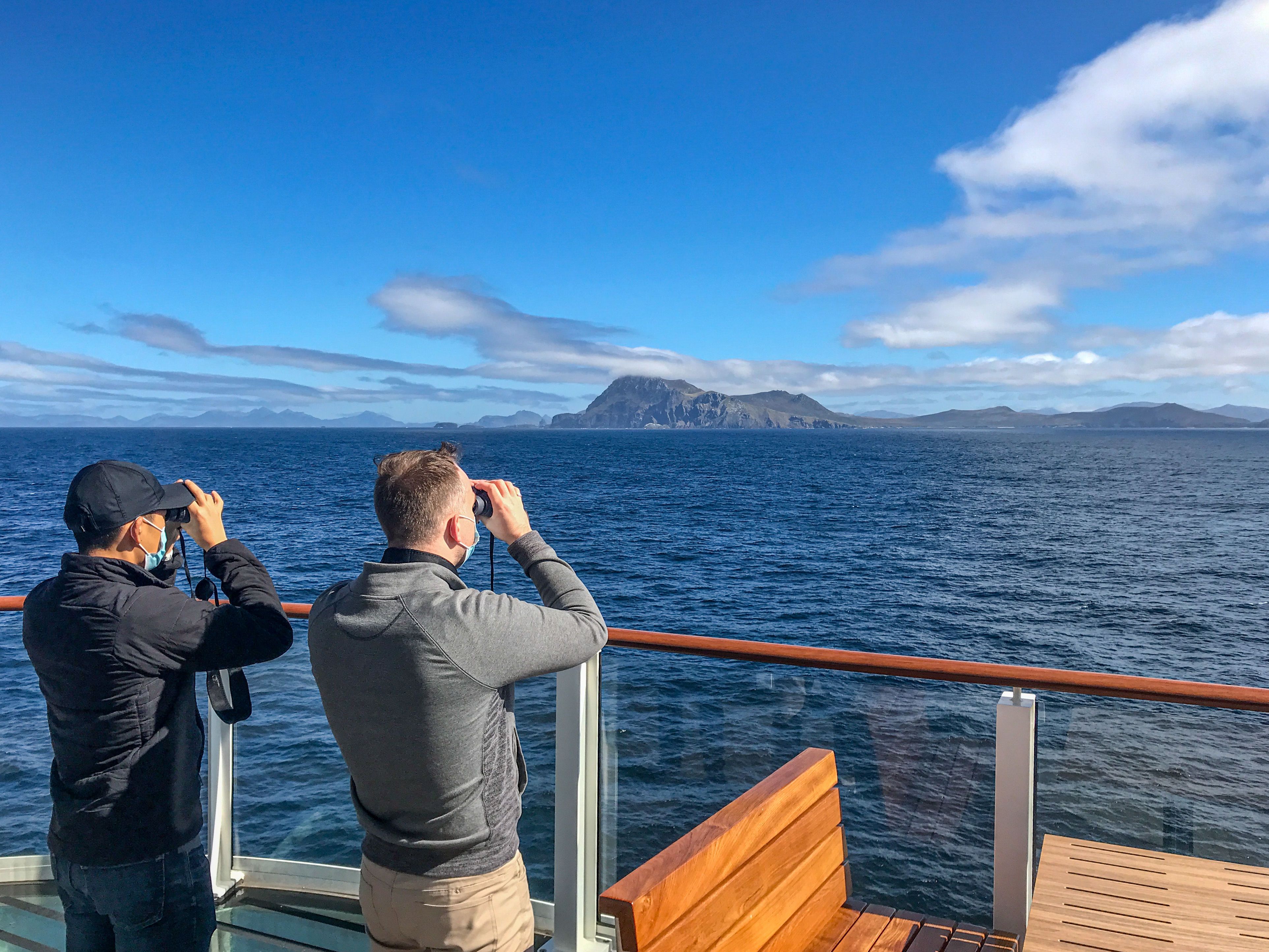 Almost home. Land is in sight as we complete our crossing of the Drake Passage and draw within view of Cape Horn. As sunrise begins to illuminate the clouds, we see the blinking light of the Cabo de Hornos lighthouse. Expedition leader Lucho tells us about the poignant albatross sculpture dedicated to lost mariners and reads us the associated poem in Spanish and English. We are sailing in sheltered waters now, and the sea has reached the balmy temperature of more than 7° C. The seabirds we have learned to recognize in the open ocean–albatrosses, petrels, and prions–are now joined by others, such as imperial shags from Patagonia. Fur seals are once again frolicking near the ship. With formalities complete, there is time for a last series of presentations from our expedition staff, including: a lively account of the world-defining voyage of Ferdinand Magellan by naturalist Madalena Patacho, intriguing ‘Behind the Scenes’ insights into the life of an undersea specialist from Brett Garner, and more about the famous Endurance expedition under the leadership of Sir Ernest Shackleton. After making time for some excellent afternoon Swedish pancakes, we sailed the remaining stretch along the Beagle Channel and came at last to port in Ushuaia. We gathered in the lounge for farewell cocktails with our captain. We celebrated the wonders we experienced over the last ten days, the good friends we traveled with and with whom we shared our discovery of the Antarctic, and the glorious land of Antarctica–the seascapes, history, and wildlife. Where will we travel next? Photo caption: An avian harbinger of the coming day. Photo by Steve Backus
