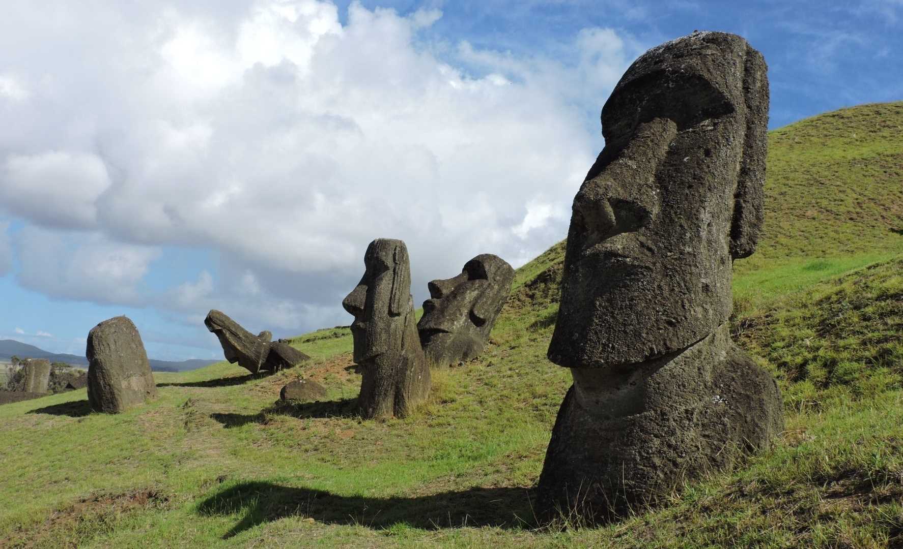 After breakfast, we all went to the most important and most impressive archeological site on Rapa Nui, the Rano Raraku quarry. One side of the Rano Raraku volcano consists of a geological formation of tuff stone that is the best material on the island for producing the huge moai sculptures. Here, we could see statues in all stages of development, from unfinished carvings within the rock face, to the finished products standing on the slope ready for transport. This is the place where most of the famous photos of the Rapa Nui statues have been taken.
