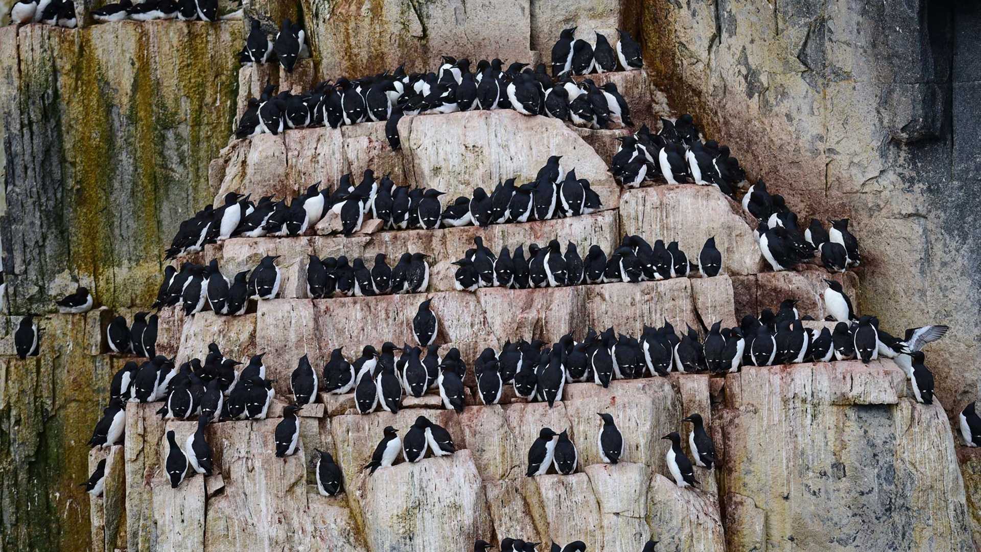 We woke up this morning to a sky full of birds. The ship was pulled up close to Alkefjellet, near Cape Fanshawe, by 6 a.m., and we spent the early morning in front of a beautiful series of cliffs that are the nesting site for over 100,000 breeding pairs of Brunnich’s guillemots, in addition to glaucous gulls and kittiwakes. Hundreds of birds flew over our heads and hundreds more swam around the ship. Early light and some beautiful mist made for a gorgeous start to the day.