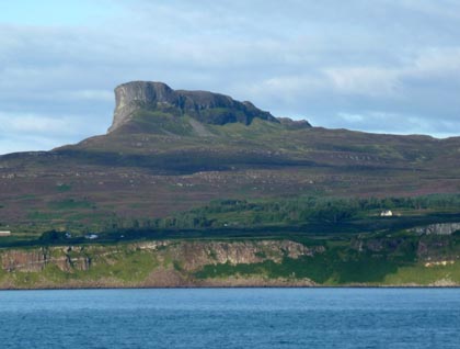 Our course this morning was past the ferry port of Mallaig and out into the open waters to the Small Isles, past the southern tip of Skye, yesterday’s playground. A fine panorama lay before us, with the dramatic volcanic island of Rum to starboard, the low island of Muck to port, and the distinctive silhouette of Eigg on the bow. Seen from northeast, it has a distinctive notch, which prompted its Viking name, but the most striking feature is a cockscomb ridge called the Sgurr, remnant of an outpouring of hard volcanic pitchstone which has left it with its trademark helmet. The currents that swirl between these rocky islands create rich feeding grounds for the local wildlife. We saw small groups of porpoise close to Eigg, and numbers of guillemot and razorbill, among them the first fledged chicks of the year.