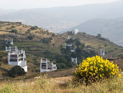 The landscape is also marked by windmills to grain cereal to make flour, humble cubic structures in the fields to be used during harvest time by the farmer’s family, and shelters for goats, sheep and cows giving milk for the making of the famous Tinos products. The most characteristic feature of the Tinos landscape is the dovecots, white washed masterpieces of traditional architecture. Economic unites once, now beautiful relicts of past ages. After this fascinating drive we arrive to the village of Pyrgos to visit the marble crafts museum with the focus on marble, from the extraction to manufacturing, to artist creation. This museum was an unexpected pleasant surprise in terms of quality of display and learning experience. We continued to the village, passing by the cemetery with beautiful marble monuments carved by some of the best modern Greek sculptures for their family graves. The village was beautiful with its whitewashed houses, the narrow alleys spotted by flowers. We sat in the square with the public fountain, the coffees shops, all shaded by an old plane tree. We enjoy the coffee and local desserts and explore the photogenic village with the small store of the beekeeper, the marble worker, the itinerant vendor, etc.