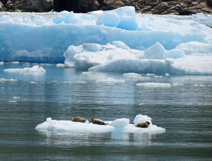 Bump, scrurr, bump, were the noises we awoke to this morning as the National Geographic Sea Lion navigated through the icebergs, bergy bits, growlers, and brash ice in Tracy Arm fjord.  The sun was shining warmly upon us as we approached South Sawyer glacier in the DIBs.  The massive quantities of glacial ice in the water provided photo opportunities, navigational challenges, and ample substrate for harbor seals to haul out on.  This time of year, harbor seal females use the glacial ice to give birth and nurse their young and rest.   We were fortunate enough to see several harbor seal pups nursing.   The high fat milk of the harbor seals is essential to the pups who will only be with their mothers for a relatively short period of time.