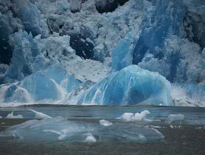 The tide had continued to drop and ice was still coming away from the face in small pieces...all along the face small bits were cascading into the sea. The face of South Sawyer was slowly, very slowly breaking away in sections. Right on cue, near an arch, there were small pieces, bigger pieces and then...A HUGE SECTION OF THE RIGHT FACE FELL AWAY into the sea followed by a fifteen foot rolling wave! Zodiacs faced into the rolling wave and road out a short series of waves. We backed away as brash ice followed. We yelled, cheered, witnessed, heard and felt the gift of being in an ice world. The air was filled with the sound of white thunder. We safely maneuvered our Zodiacs in front of South Sawyer Glacier, on our last day of exploring the world of Alaska in the north of the Northwest Coast.