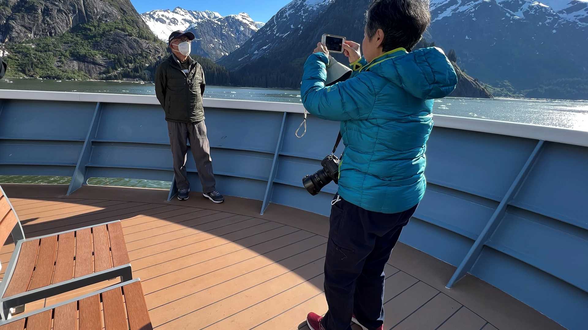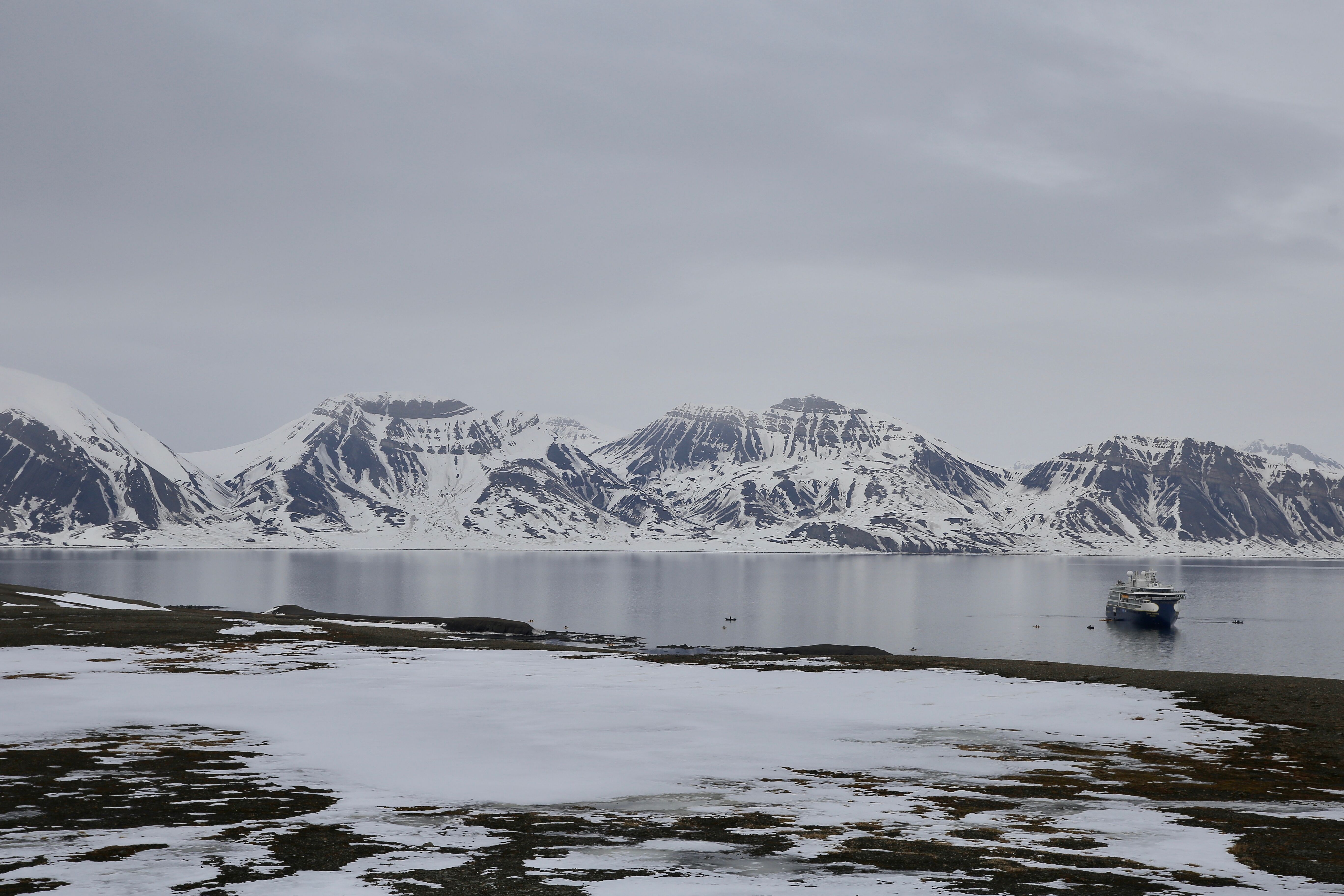 Southeast Alaska changed its usual rainy tune today and put on its Sunday best, with blue skies and blue ice all around us. After a spectacular morning meandering into Tracy Arm, we piled into Zodiacs to get a closer look at the towering cliffs, sculptured icebergs, and even a local bear fresh from hibernation, hiding high in the shrubbery and enjoying a springtime snack.