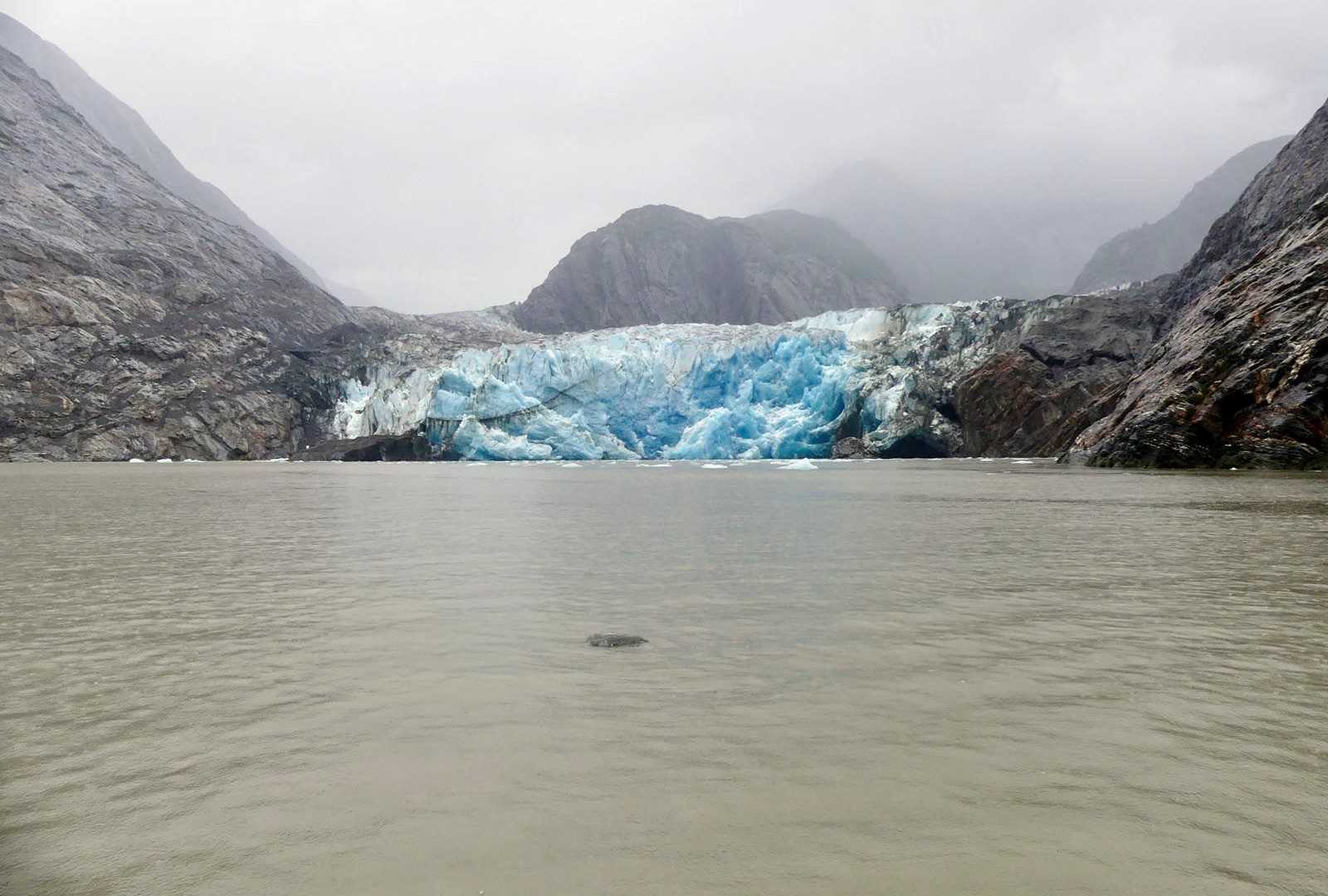 At the head of the fjord we reached the remnants of the glaciers that carved it: the Sawyer and South Sawyer glaciers. We bundled up, donned our raingear and boarded our inflatable watercraft to cruise to the face of the Sawyer Glacier. Chunks of glacial ice of all sizes (brash ice, growlers, bergy bits, and the occasional iceberg) floated in the silt-filled water. We gaped in awe at the blue color of the ice and waited in anticipation for a calving event, where ice completes its journey from the ice field above us to the sea.
