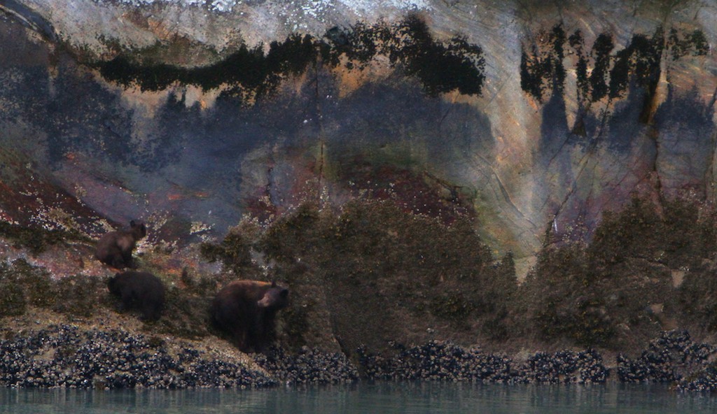 We started our journey together today and it was a beautiful Southeast Alaska morning. We woke to a soft rain and low hanging clouds in Tracy Arm. Before breakfast we encountered a shy black bear on the shore followed by a much less shy black bear sow with her two cubs. We had clear views of these gorgeous bears and watched them forage along the shore.