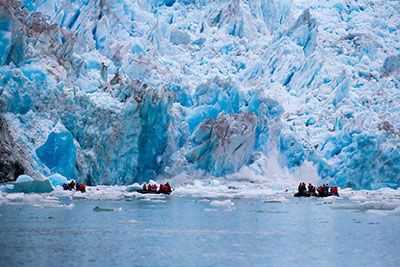 After taking in the sights of ephemeral waterfalls and Sitka spruces, we broke for a delicious lunch and immediately prepared for our first Zodiac tour. In this first excursion, National Geographic Quest parked just a few miles from the face of South Sawyer Glacier, one of two glaciers in Tracy Arm, and an area described by John Muir in the 1880s as an unfinished iteration of Yellowstone. Indeed the views, and in particular, the geology of this part of Tongass National Forest are remarkable.