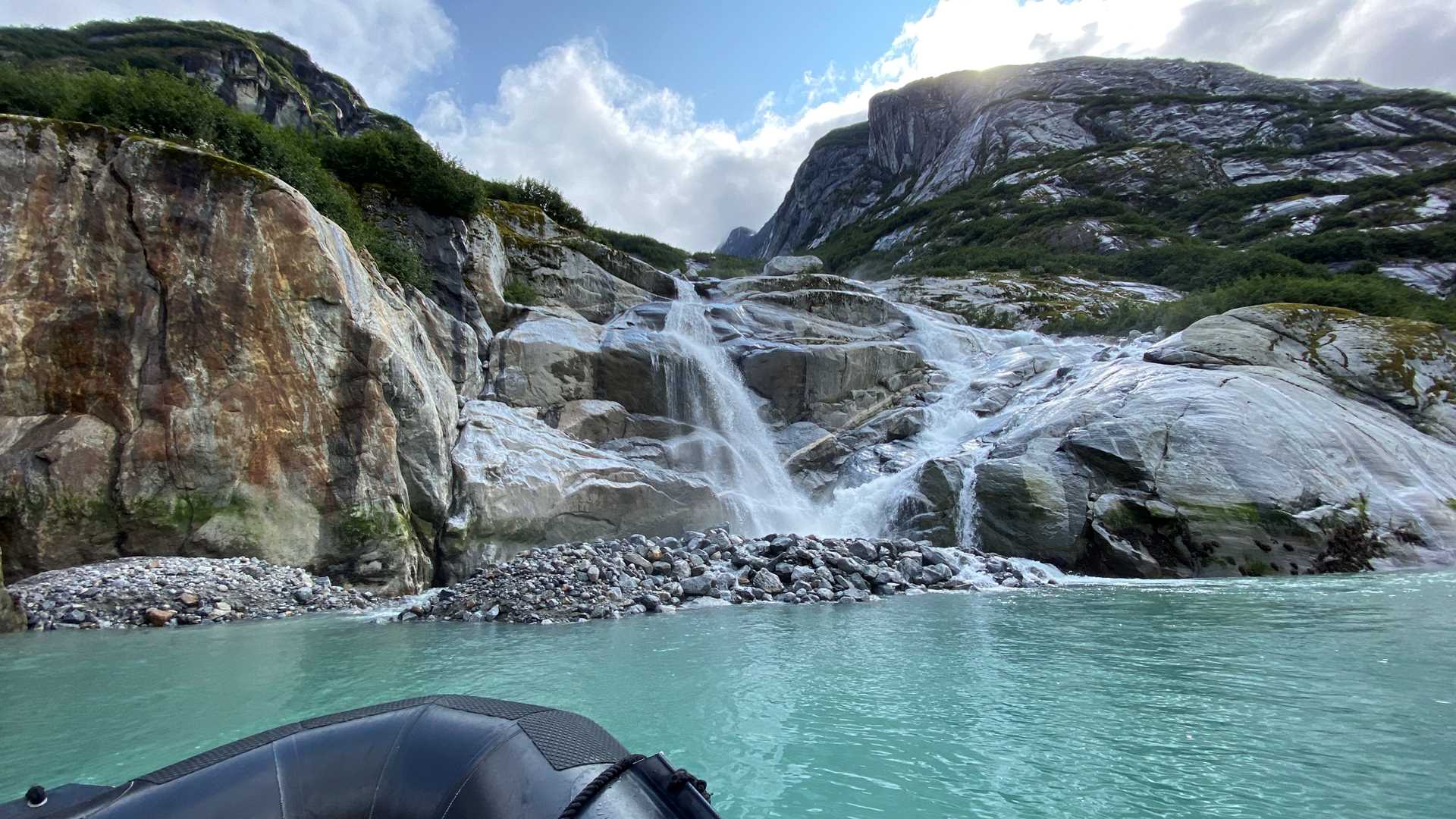 Finally, it was time for a closer look. We each found a spot in a Zodiac and wove around ice, skirted waterfalls, and felt the wind on our faces as we made our way to the face of the glacier. While we waiting to see the glacier face calve, we enjoyed listening to the sounds of the ice fizzing and knocking together, as the adorable gray faces of curious harbor seals peered at us from time to time. Suddenly, a giant block of ice sprang free from where it had been held in the glacier for the last few thousand years and plummeted into the fjord with a thunderous boom and a mighty splash. The calving continued and the sun even came out, showing off the blue ice in even greater brilliance, as we enjoyed having this incredible wilderness all to ourselves.