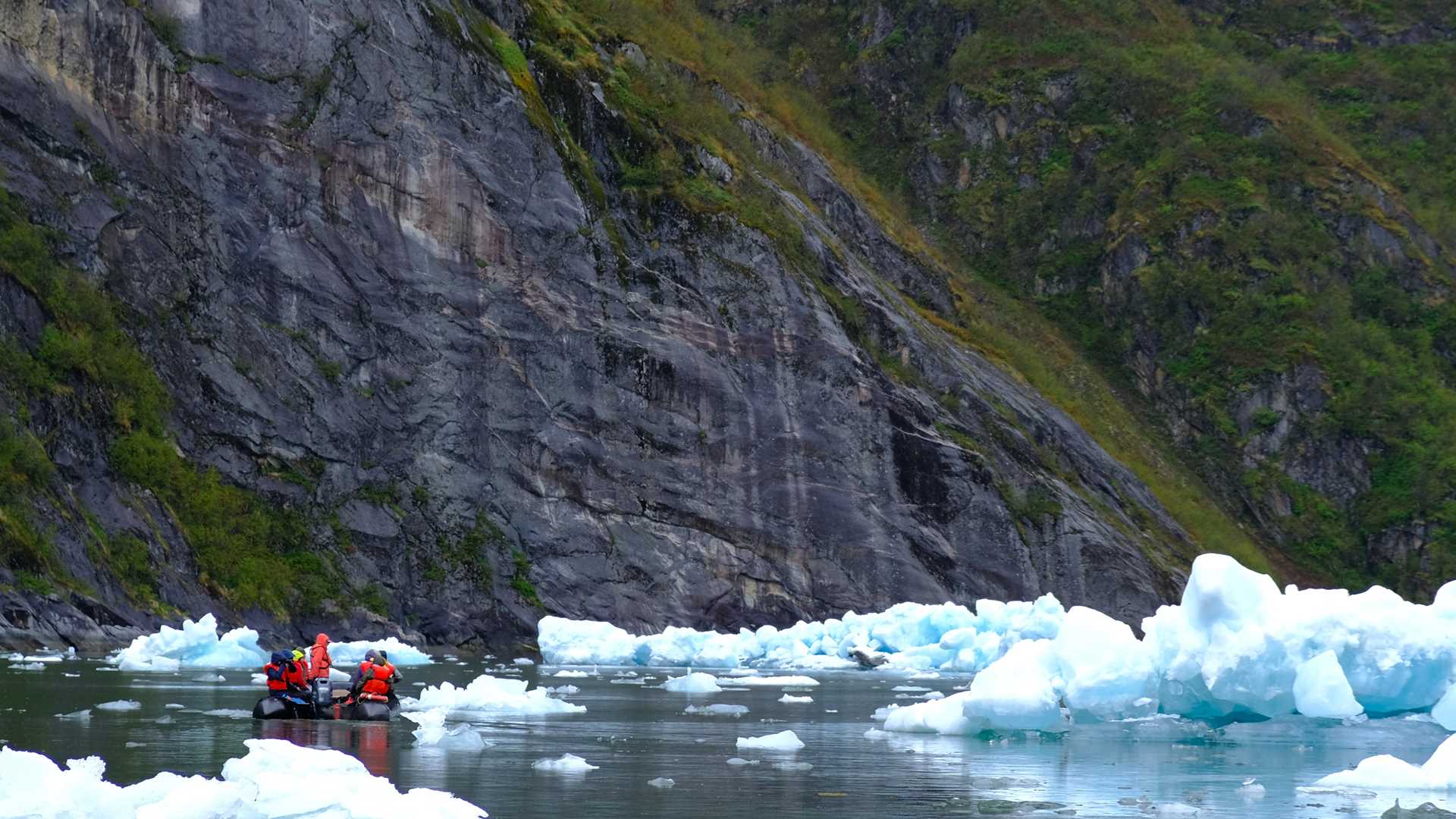 Before breakfast this morning, National Geographic Venture crossed "the bar," the shallow terminal moraine at the entrance of Tracy Arm. Farther up the fjord, bergy bits and growlers became much more numerous. When the ice became too thick for our ship to navigate safely, we boarded Zodiacs to cruise among the myriad of beautiful pieces of floating ice. In the afternoon, we stretched our legs in the forest at Williams Cove.