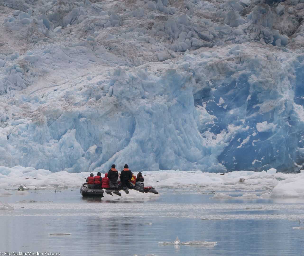 Today we explored the Tracy Arm–Ford’s Terror Wilderness. It was a good day to gaze at towering rocky cliffs streaming with a multitude of waterfalls, serene valleys lined with green vegetation, glaciers hanging in the mist on high peaks, and a fjord dotted with sculptured ice.