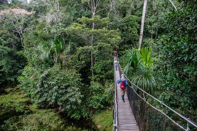 With a 6 a.m. wake up call, we headed for a fantastic breakfast full of fresh fruit, French toast, and many other delicious delicacies. We needed our energy for a jungle walk through the forest private reserve known as the Amazon Natural Park. We spotted many interesting things along the walk, and tried our hand at extracting rubber from the rubber tree, which everyone enjoyed. The trail winds through the forest until it reaches the treetop walkways and suspension bridges that provided an incredible treetop view of this amazingly preserved forest.