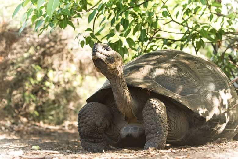After breakfast, we arrived at the gray-sand coast of Isabela Island. We hiked inward, searching for the natural habitat of the Galapagos land iguana and other endemic species in the area. It was not long down the trail before we encountered a young female giant tortoise. This species of tortoise belongs to Alcedo Volcano, one of the major volcanoes on Isabela. The more we walked, the more surprises came along. In the end, our group spotted no less than five tortoises as well as several land iguanas and a large collection of well-known Darwin finches.