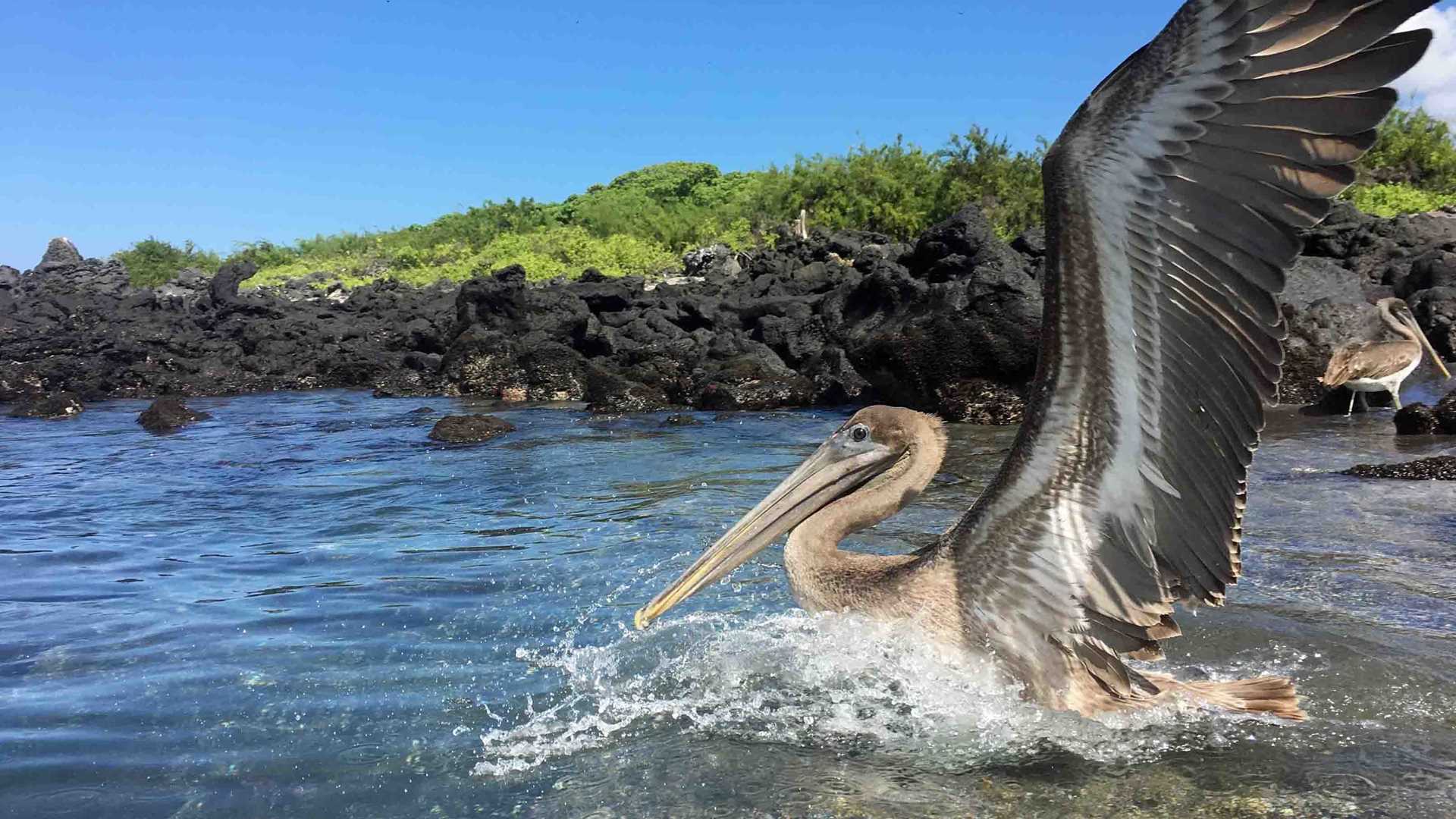 During the walk we were surrounded by salt resistant vegetation with Galapagos mocking birds and Darwin finches appearing on the top branches to sing. As we venture farther inland we come upon a hearty population of Galapagos Land Iguanas. We saw many of them along the trails. Many native and endemic flowers were found everywhere, including the beautiful Galapagos cotton and yellow cordia flowers. We saw several Galapagos giant tortoises as well. The latter sighting was a grateful surprise. At the end of the walk, we had the chance to cool off in the black lava-landing beach with the company of many juvenile brown pelicans who let us share their space with them.