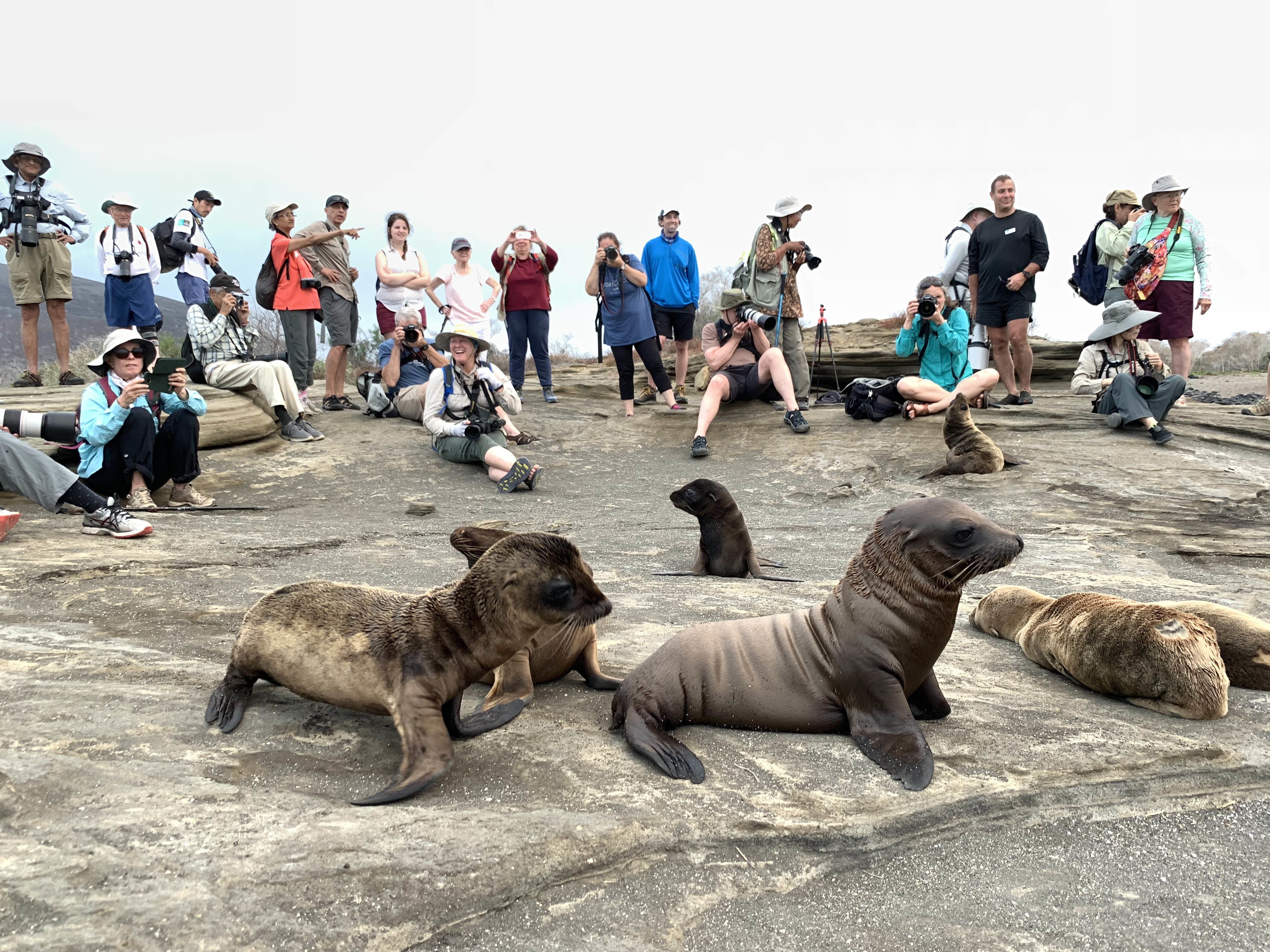 We woke up early in the morning as National Geographic Islander navigated along the northern part of Isabela Island. Slowly the sun appeared above the clouds surrounding Volcano Wolf. We spotted our first birds as Galapagos fur seals returned to shore from their night hunt. We enjoyed a great breakfast. Afterward, expedition leader Vanessa called everyone to the bow to celebrate as we crossed the equator. Our guests happily crossed the line. Approaching Punta Vicente Roca, the visitor site, we spotted Galapagos sea lions and a good number of ocean sunfish. The first activity of the day took place as we dropped anchor at Punta Vicente Roca. This is a spectacular geological site. The combination of the former volcano’s tall cliffs and the tuff cones formed later adds an amazing contrast to this unique visitor site. Our best tools for exploration, our Zodiacs, were lowered down, and off we went to explore the coast. We observed Nazca boobies and blue-footed boobies resting on the small ledges of the tuff cones. Galapagos sea lions swam close to our Zodiac, and Galapagos penguins rested on a broken piece of the tuff cone after feeding. What a wonderful sight! In a calm area, we found a good number of Pacific green sea turtles. The morning’s activities ended with snorkeling. Pacific green sea turtles, plenty of colorful fish, Galapagos marine iguanas and flightless cormorants surrounded us. It was a phenomenal experience! The ship was repositioned toward Fernandina Island. The youngest island of the archipelago, Fernandina is a highlight of our expedition. This island shows our guests the beginning of life. We observed animals thriving in the hostile environment. Pioneer plants like lava cacti grow on the lava fields, breaking down rocks little by little to create soil for the next generation of plants. Punta Espinoza is known for its huge colony of Galapagos marine iguanas. It is hard to distinguish the iguanas from rocks since they are so dark in color. On the other hand, colorful Sally Lightfoot crabs added contrast to the young, dark lava fields. We ended our walk as the sun was setting, returning to the ship with great memories. It was a fantastic day in the western part of the archipelago.