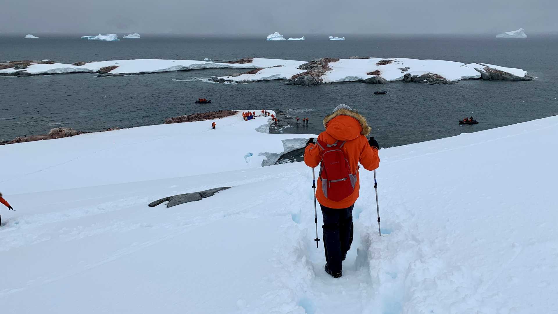 We spent Christmas Eve morning around Useful Island with two rounds of Zodiac cruises to look at icebergs and penguins. We also had a landing on the island, which is home to a colony of gentoo and chinstrap penguins. There was an optional hike up a steep snowy trail to the top of the island for a scenic view. At the top, there was a red metal cylinder used to survey the islands. There were also nesting sites for both gentoo and chinstrap penguins at the summit.