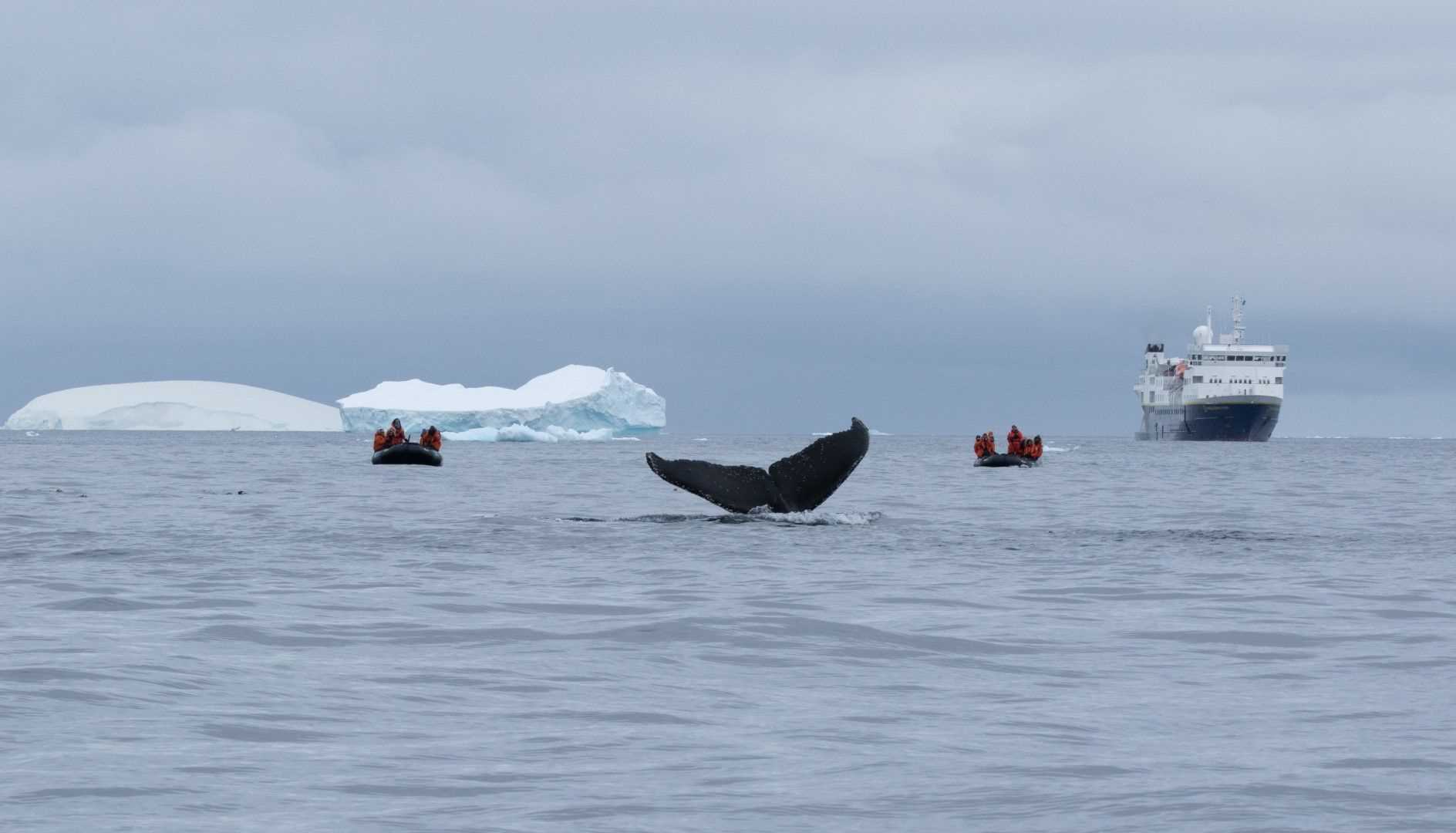 It wasn’t long before several naturalists spotted a large gathering of gentoo penguins floating on the water’s surface. Suddenly a humpback whale surfaced adjacent to the Zodiacs and guests were treated to some superb views of these fantastic creatures. It was obvious both the whale and the penguins were taking advantage of the rich supply of krill in that particular spot.