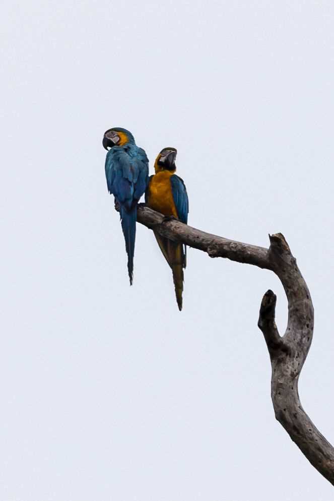It wasn’t long before we were rewarded with a few groups of blue and yellow macaws in plain view. Also in the area were red-bellied macaws, some audible, but not visible, parrots, and various other jungle birds joining the morning chorus. After viewing the macaws, we headed towards land to explore the Varzea forest a bit. This is the part of the jungle that will be under water for many months of the year. As the wet season has just started, we were still able to access this area and view the buttressed roots on several trees, the vines hanging down from above, seeking a location to take root and a few heliconia flowers with their bright red bracts that serve as a wonderful attractant to one of their main pollinators: hummingbirds.