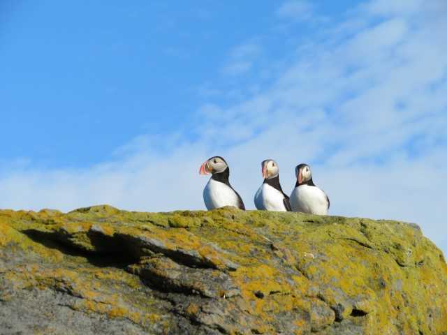 We anchored on this sunny morning off the small island of Vigur in Ísafjörđur, the “icy fjord”. Our fleet of Zodiacs was soon launched and took us to the dock where we were greeted by puffins and by the family who has farmed on this lovely and isolated island for generations. Here down from the nests of wild Common Eiders is collected, cleaned, and sold for making eiderdown comforters and pillows. The eider ducks are never harmed by this practice and, indeed, the farmers care for the orphaned ducklings. The shore was crowded with striking black guillemots. Puffins lined a cliff top. We were guided along a path through a grassy meadow where Arctic terns were nesting. We were served coffee and delicious cakes. The weather was so pleasant we sat outside and basked in the sunshine while enjoying the wonderful view over the fjord.