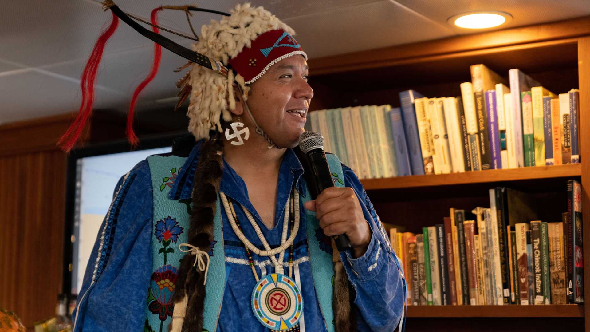 Following our morning meal, we are joined by Nez Perce storyteller JR Spencer. Wearing his Sunday best that includes an ermine hat, and braids wrapped in otter fur, JR certainly looks the part. But what stands out more than his dress is his mastery of his craft. By the time he is finished, I am convinced that not only did Coyote create the world, but that we were in his presence this morning. Who but the Trickster himself could have such a twinkle in his eye as he weaves Oreo cookies and Mighty Mouse into ancient chants?