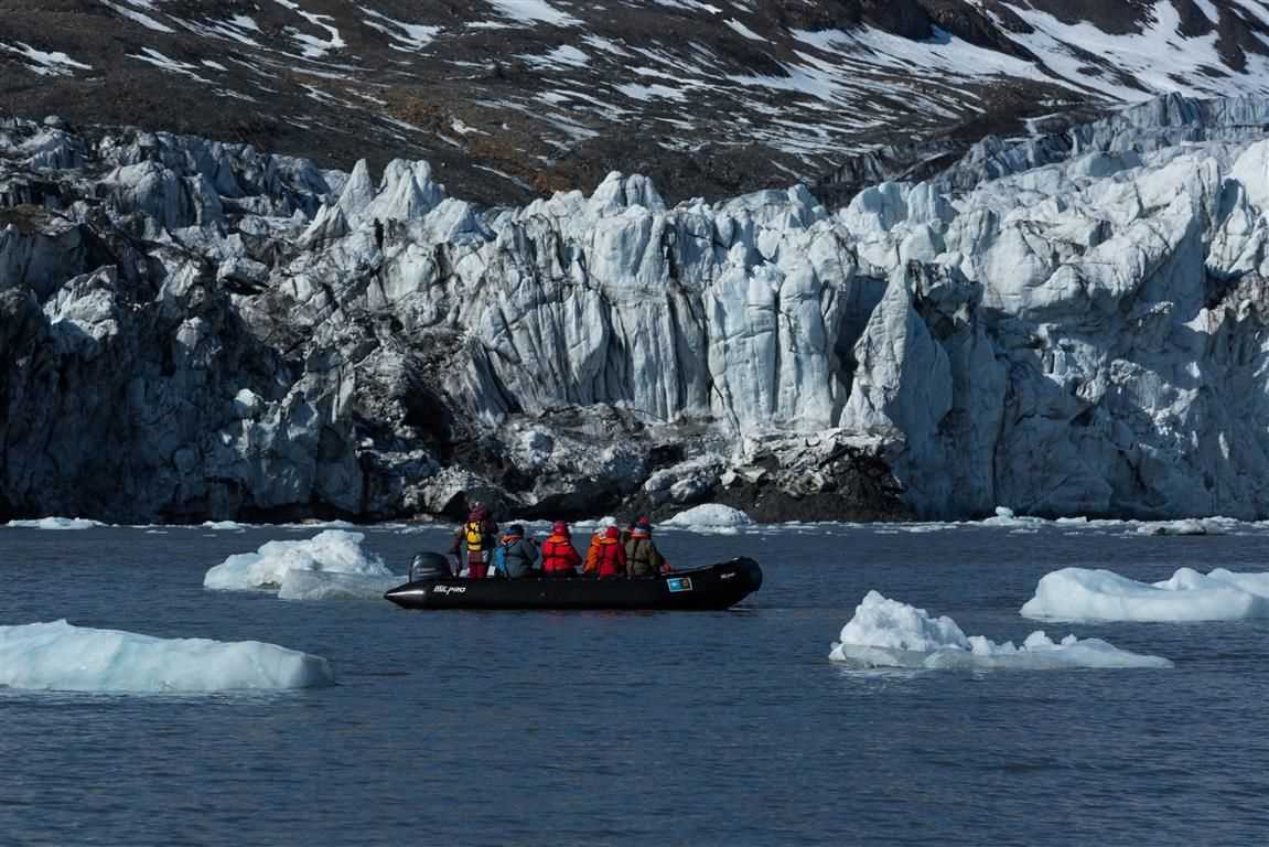 We woke to sunshine! Well, a little, anyway, and that increased throughout the morning. This was ideal for our morning activity of a Zodiac cruise in Bellsund by two large glaciers. As well as beautiful glacier views, we also had lots of ice in the water to drive through, a tern colony on a small island near the glacier, and several bearded seals resting on icebergs and cruising through the water.